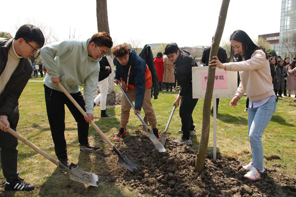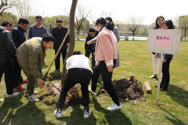 植樹現(xiàn)場,校領(lǐng)導與師生代表熱情高漲、干勁十足。根據(jù)安排挖坑、埋土、澆水,分工明確,互相配合,活動有序地進行,場面氣氛活躍。