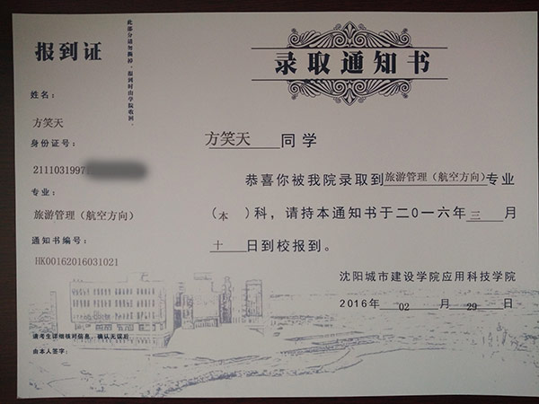 恭喜方笑天同學(xué)被我校錄取【沈城建航空】
