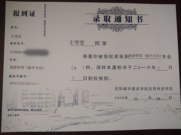 恭喜王雪雯同學(xué)被我校錄取【沈城建航空】