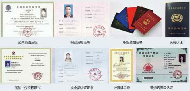 公共英語三級證書、民航崗位資格證書、民航禮儀資格證、安全員認證證書、計算機二級、普通話等級認證、國際航協(xié)航航空公司乘務(wù)課程合格證等。