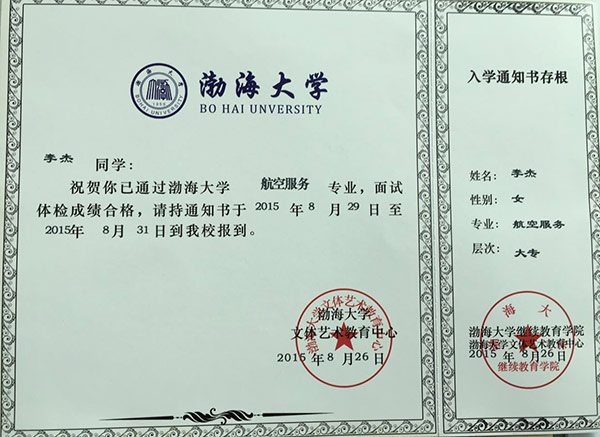 恭喜李杰同學(xué)被我校錄取【渤海大學(xué)航空】