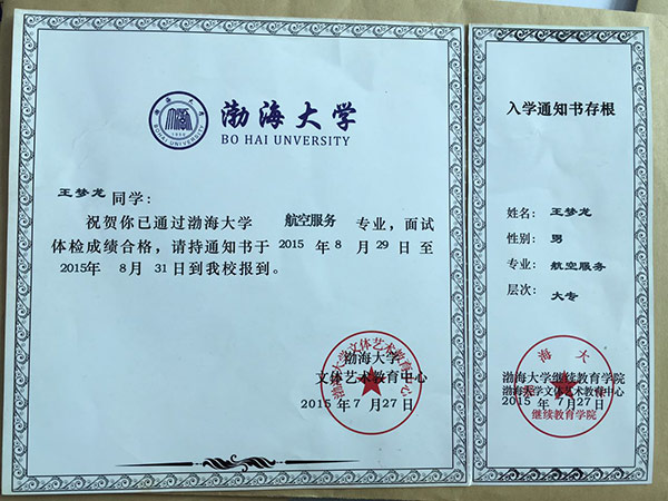 恭喜王夢龍同學(xué)被我校錄取【渤海大學(xué)航空】