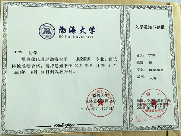 恭喜丁浩同學(xué)被我校錄取【渤海大學(xué)航空】
