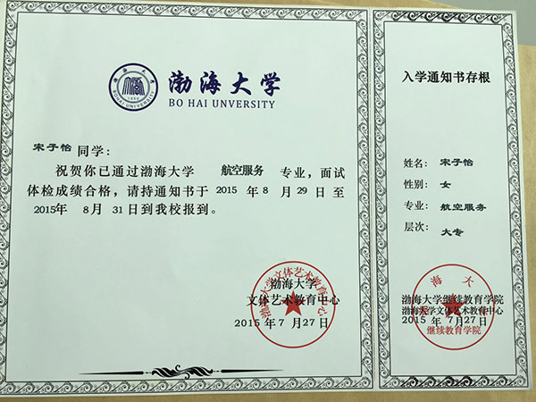 恭喜宋子怡同學(xué)被我校錄取【渤海大學(xué)航空】