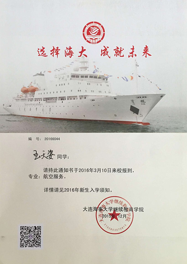 恭喜王天姿同學(xué)被我校錄取【大連海事大學(xué)航空】