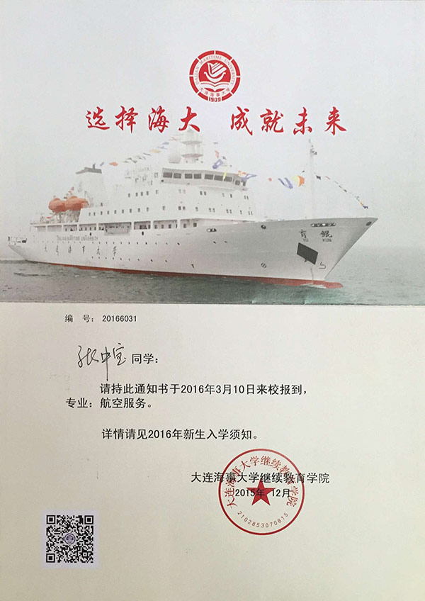 恭喜張中寶同學(xué)被我校錄取【大連海事大學(xué)航空】
