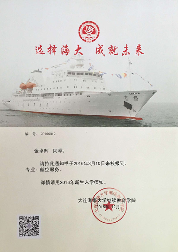 恭喜金卓輝同學被我校錄取【大連海事大學航空】
