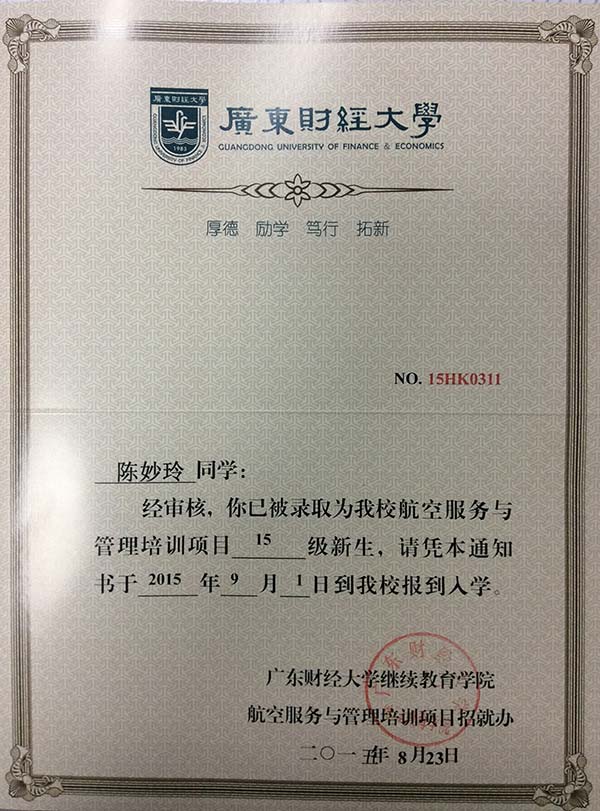 恭喜趙琪同學(xué)被我校錄取【廣財(cái)航空】