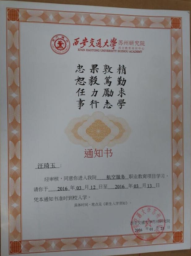 恭喜汪琦玉同學被我校錄取【西交大蘇州航空】