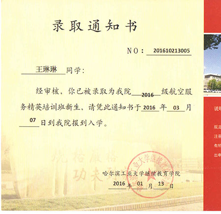 恭喜王琳琳同學(xué)被我校錄取【哈工大航空】