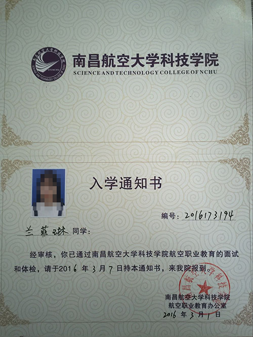 恭喜蘭菲琳同學被我校錄取【南航航空】