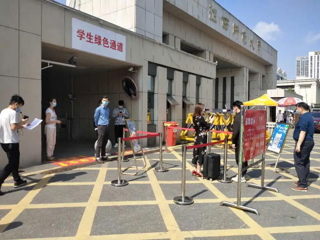 為進(jìn)一步做好學(xué)生返校各項(xiàng)準(zhǔn)備工作,切實(shí)提高學(xué)院學(xué)生返校疫情防控和各部門面對突發(fā)疫情的應(yīng)急處理能力,保障師生返校各項(xiàng)工作安全有序開展。江西師范大學(xué)青山湖校區(qū)于2020年5月26日下午在南門開展了復(fù)學(xué)疫情防控演練,學(xué)校教職員工參加演練,確定學(xué)校各個部門,各個環(huán)節(jié)通過演練熟悉應(yīng)急預(yù)案及操作流程。