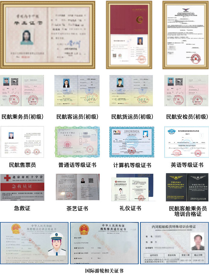 可根據(jù)所學(xué)專業(yè),參加相關(guān)部門(mén)或行業(yè)組織的考試,成績(jī)合格,可取得相應(yīng)的職業(yè)資格證書(shū),如公共英語(yǔ)三級(jí)、普通話等級(jí)證書(shū)、安檢證書(shū)、民航客運(yùn)證、急救證、海員證書(shū)、禮儀證書(shū)、茶藝證書(shū)、民航客艙乘務(wù)員培訓(xùn)合格證等。